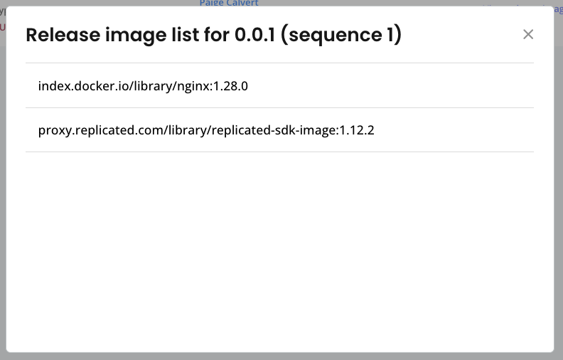 (Optional) Click View release image list to see the images that Replicated will include in the air gap bundle. This release includes an NGINX image and the Replicated SDK image, as shown below: